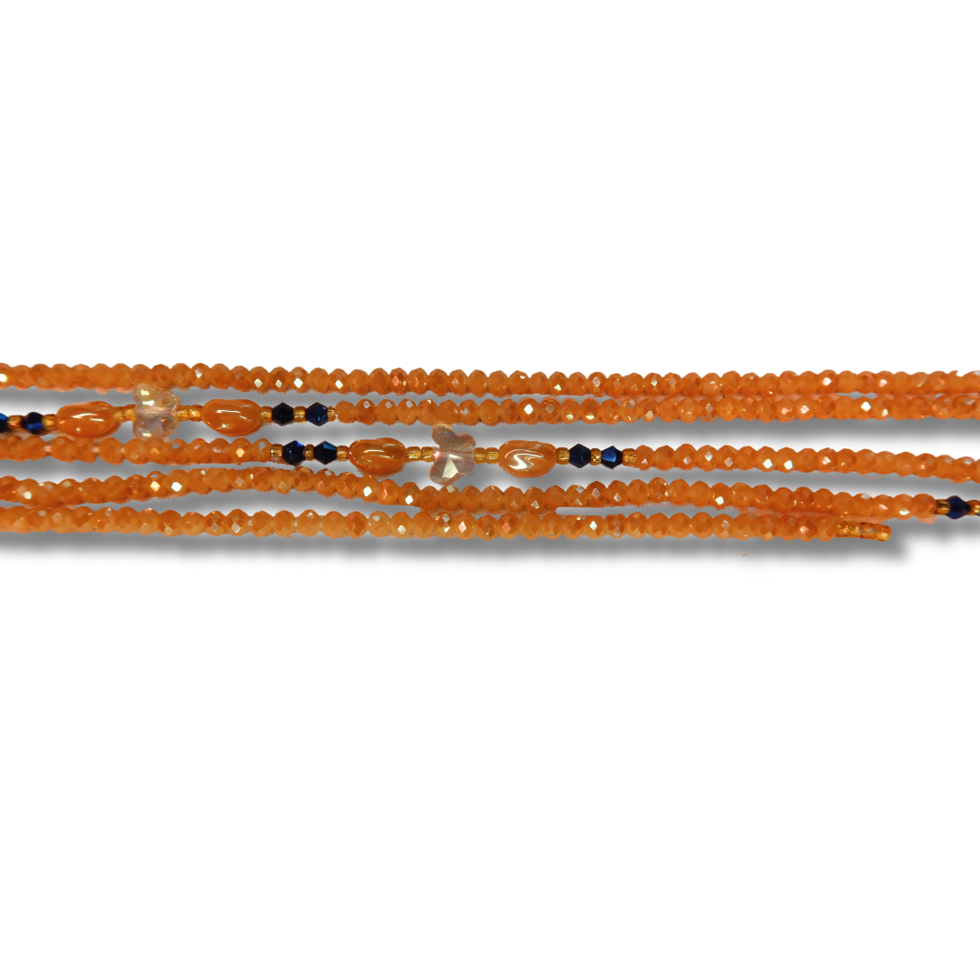This delicate waist bead strand features creamy gold-toned small beads, paired with clear butterfly crystal accents and royal blue crystal details. Handcrafted in Ghana, Abeni offers a soft yet striking look that feels both regal and ethereal. It’s perfect for the poised woman who carries quiet strength and graceful ellegance wherever she goes.