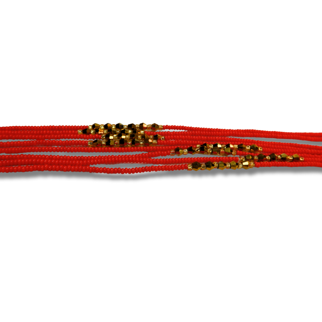 A bold strand featuring rich red seed beads with sparkling gold diamond crystal accents. Adwoa is perfect for the passionate woman who walks with fire and elegance.