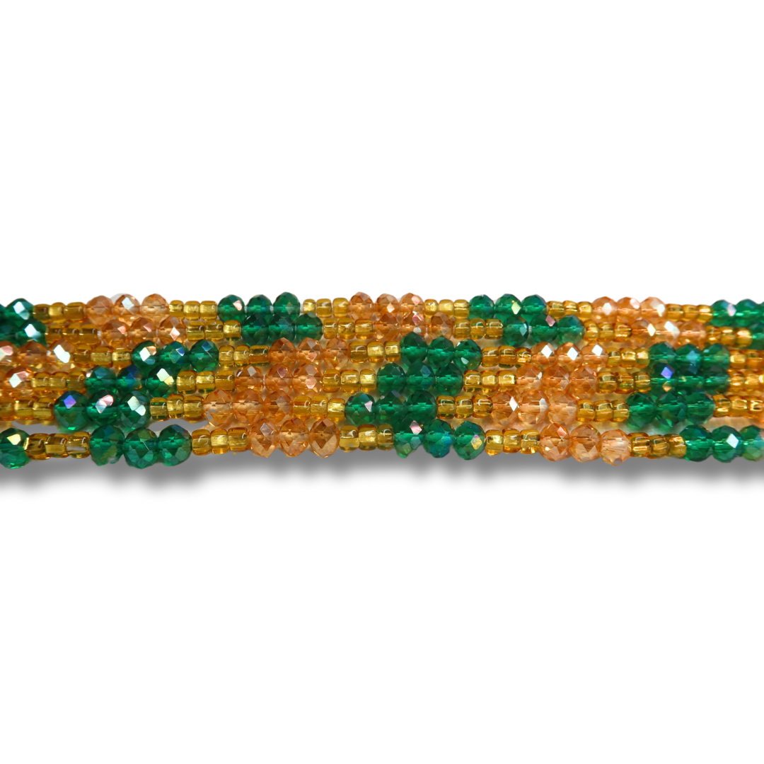Amara features stunning emerald green crystals waist beads paired with shimmering gold crystals, handcrafted with care by skilled Ghanaian artisans. This luxury waist bead strand offers timeless elegance and vibrant color, perfect for anyone seeking high-quality, handmade green crystal waist beads that make a confident style statement.