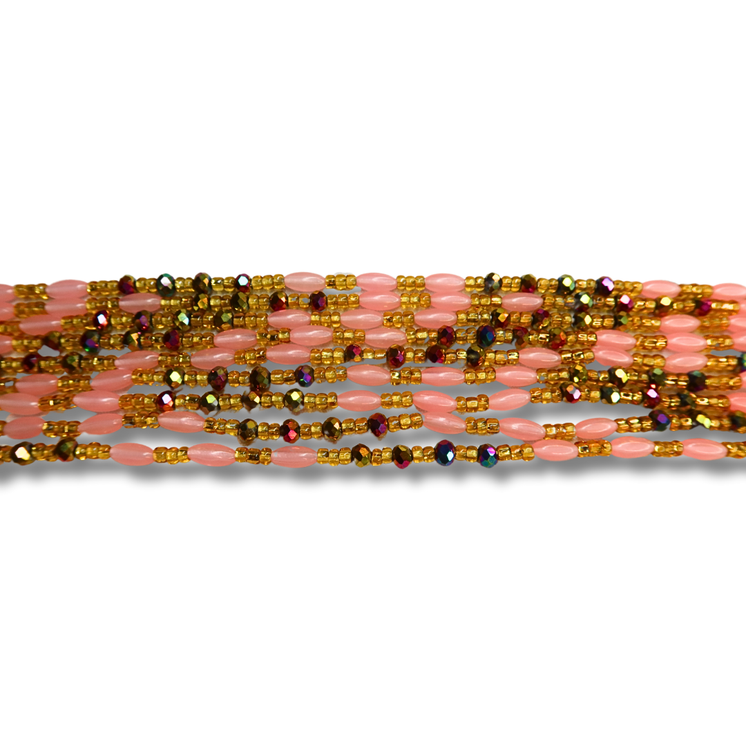 Amara is a luxurious waist bead strand made with radiant gold beads, purple and gold iridescent crystals, and soft pink cylinder accents. Handcrafted in Ghana, Amara blends regal tones with a playful touch of pink, making it perfect for women who carry both grace and personality in their style. This strand shines beautifully on glowing skin and adds instant warmth to your waistline.