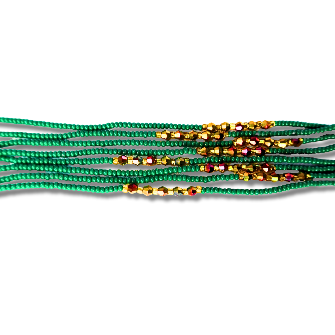 Deep green seed beads meet purple and gold iridescent diamond crystals in this vibrant design. Efua is for the grounded woman who radiates natural beauty and calm confidence.