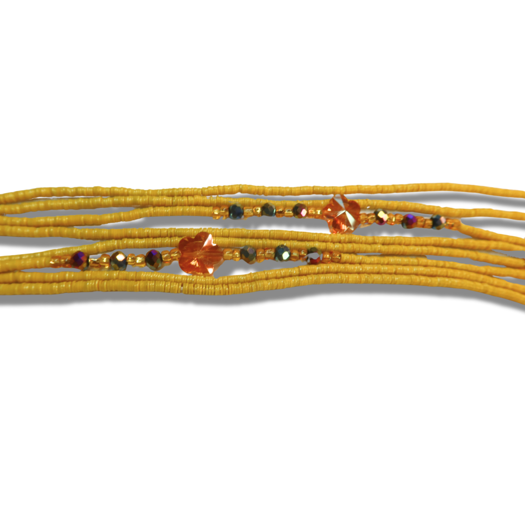 This radiant waist bead strand features sunny yellow disc beads, golden butterfly accents, and shimmering purple iridescent crystals. Handcrafted in Ghana, Emelia strikes the perfect balance between light-hearted beauty and regal detail — ideal for the joyful, radiant woman who shines with inner richness and charm.