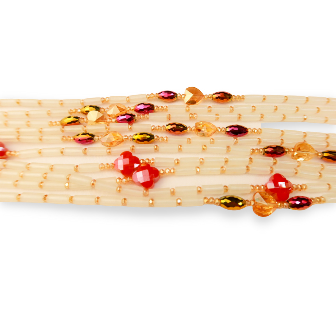 Glow in the dark (GITD) waist beads are so admonishing. It's always the most pleasant surprise when the lights go dim. These GITD beads feature gold, red, and purple iridescent crystals.