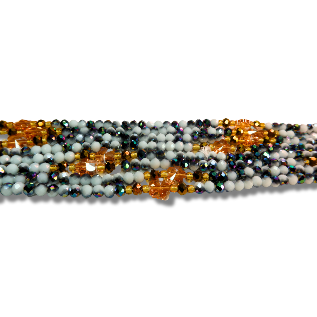 Imani is a vibrant and feminine waist bead strand made with white, purple, and green iridescent ombré beads, paired with gold floral accents and shimmering solid gold crystals. Handcrafted in Ghana, Imani blends soft color transitions with bold gold details for a playful yet elegant look. It’s a standout piece for women who embrace color and confidence in every curve.