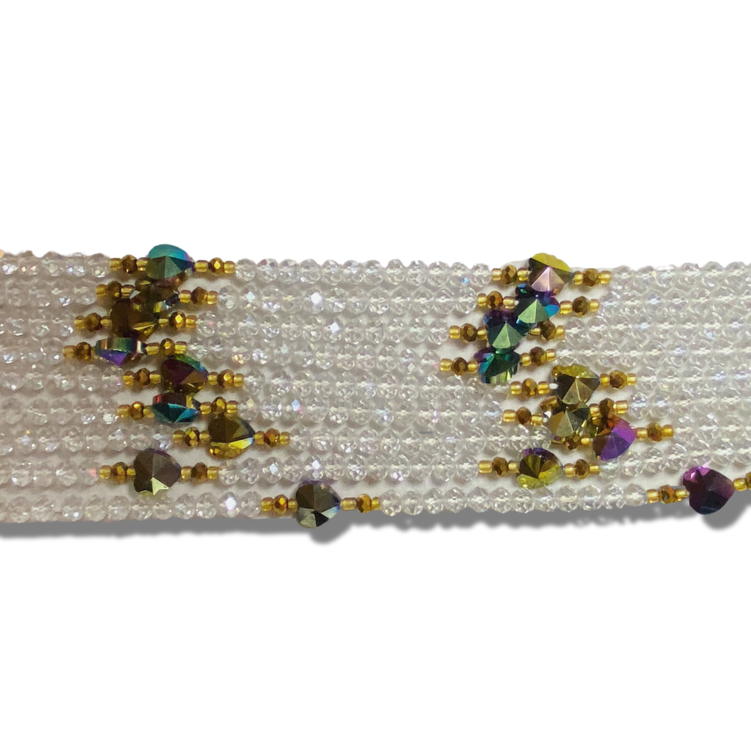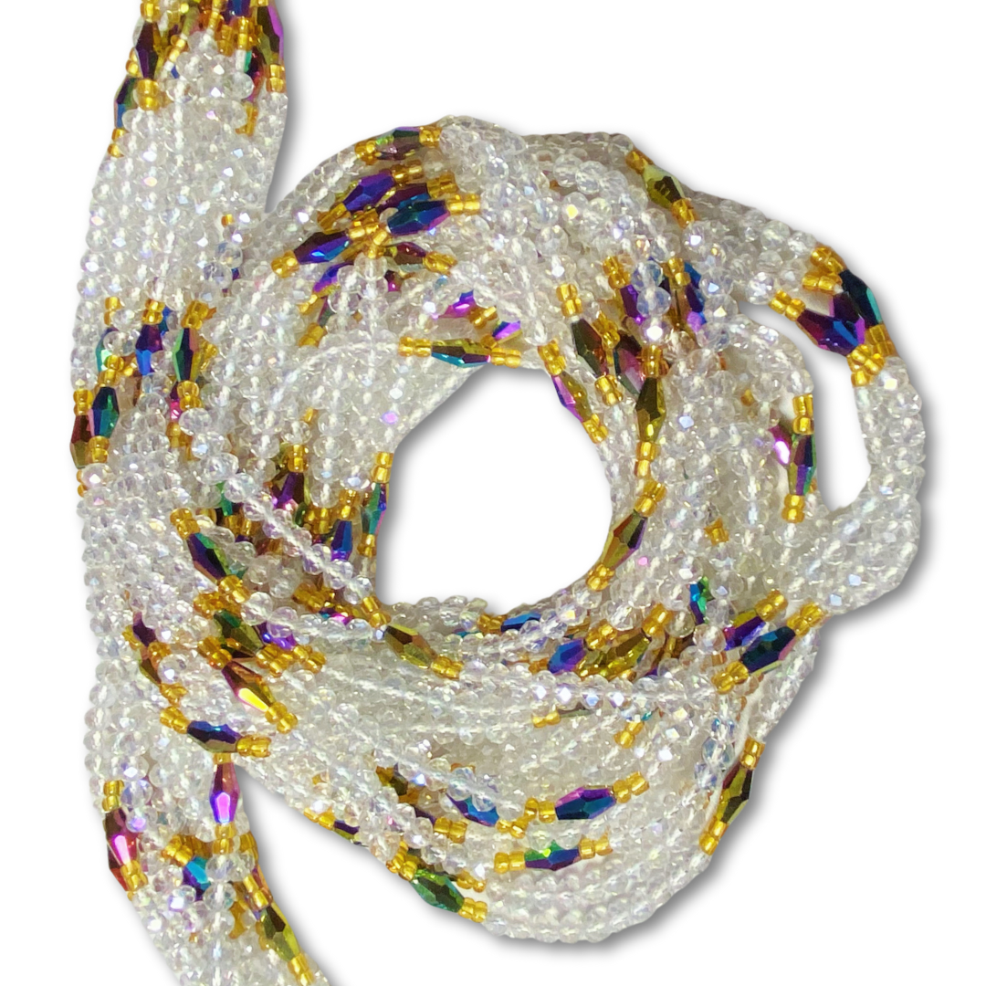 Elevate your waist with our Minaa waist beads, featuring a crystal-clear beads adorned with elegant gold accents and shimmering iridescent diamond-shaped crystals. This sophisticated combination captures light beautifully and adds a touch of glamour to your style. Embrace the timeless beauty of these waist beads,