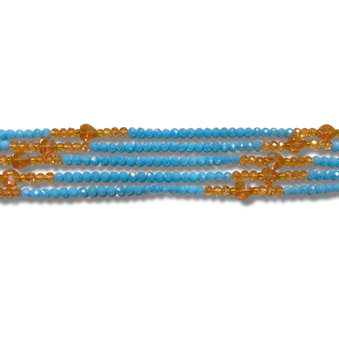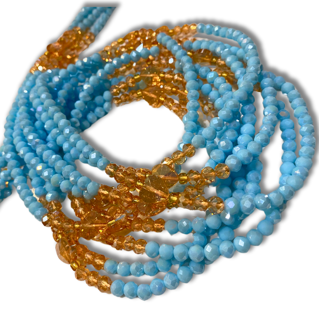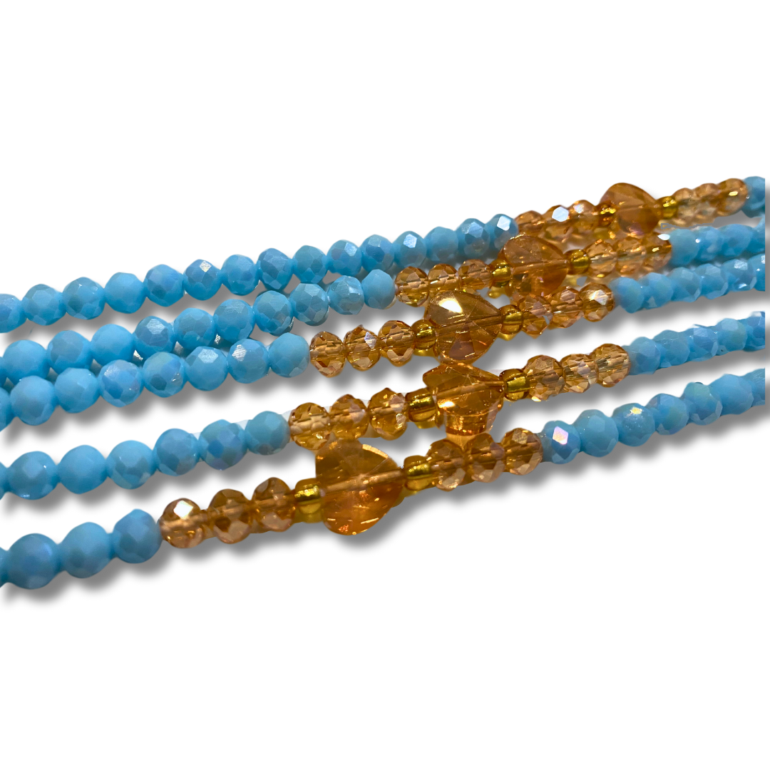 Elevate your style with the stunning Skyye waist beads in a captivating sky blue hue. Adorned with elegant gold hearts and accents, these waist beads are designed to sculpt and enhance your waist for an exquisite look.