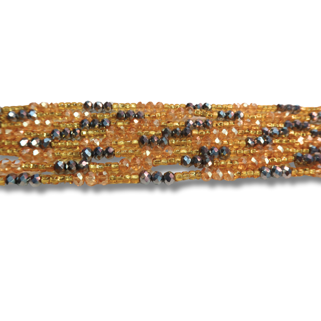 Vaeah is a timeless waist bead strand crafted with alternating gold and silver crystals in a sleek back-and-forth pattern. Hand-strung by Ghanaian artisans, this design blends cool and warm tones for a look that’s both versatile and elegant. It’s the perfect strand for women who love clean sparkle, and it looks stunning on all skin tones — especially when worn with confidence.