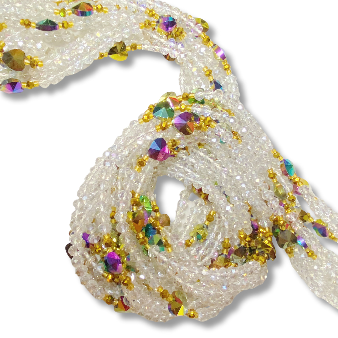 Showcasing a jumbo crystal clear waist bead accented by iridescent hearts and charming gold accents. This stunning combination exudes warmth and sophistication, making it a captivating addition to your waist bead collection.