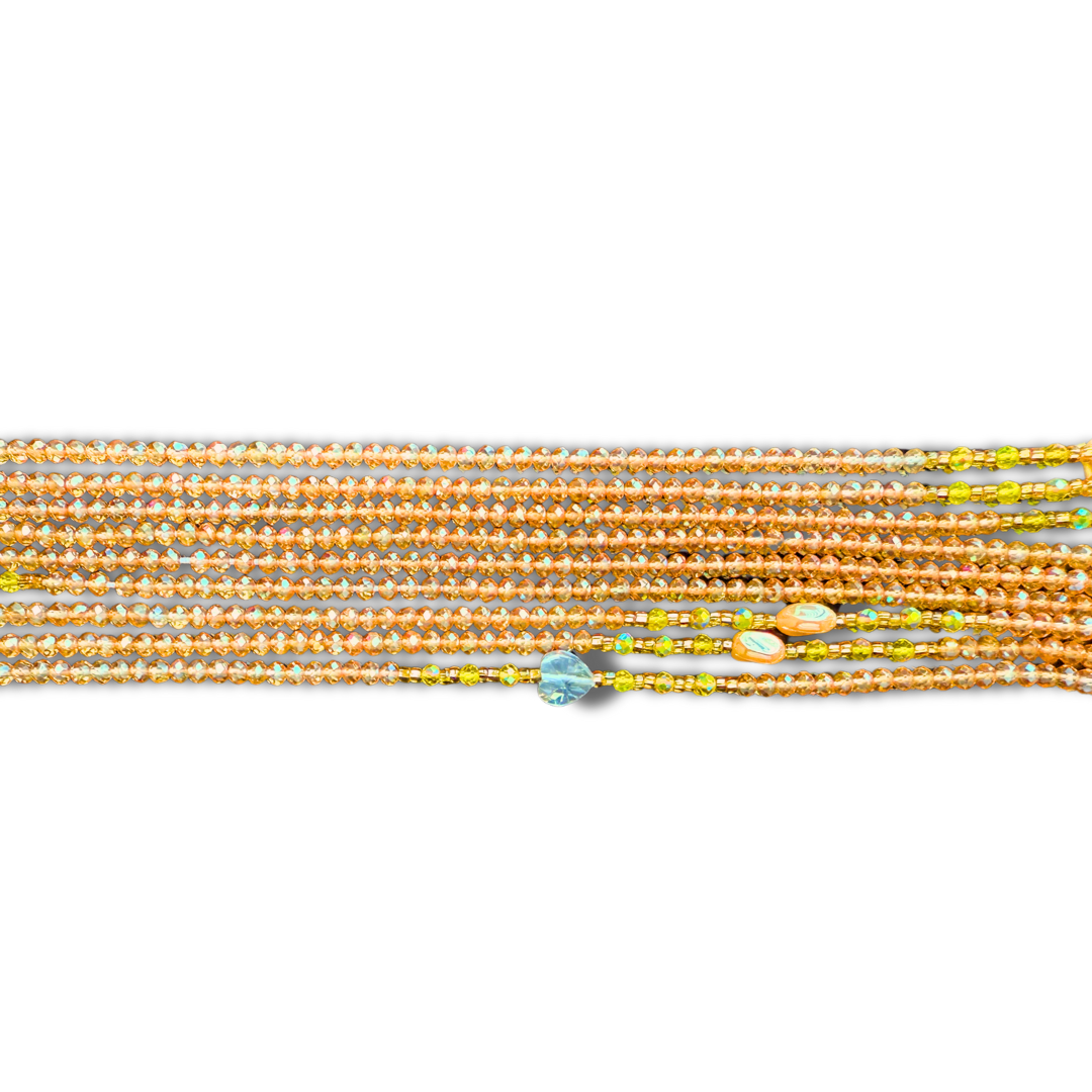 Zuri is a delicate and radiant waist bead strand featuring beautiful gold small-sized crystals, mini yellow crystal accents, creamy gold pearls, and transparent clear crystals. Handcrafted in Ghana with exceptional attention to detail, Zuri brings together soft glow and sunny charm in a refined, lightweight design. It’s perfect for women who love a subtle sparkle with just the right touch of warmth and elegance.